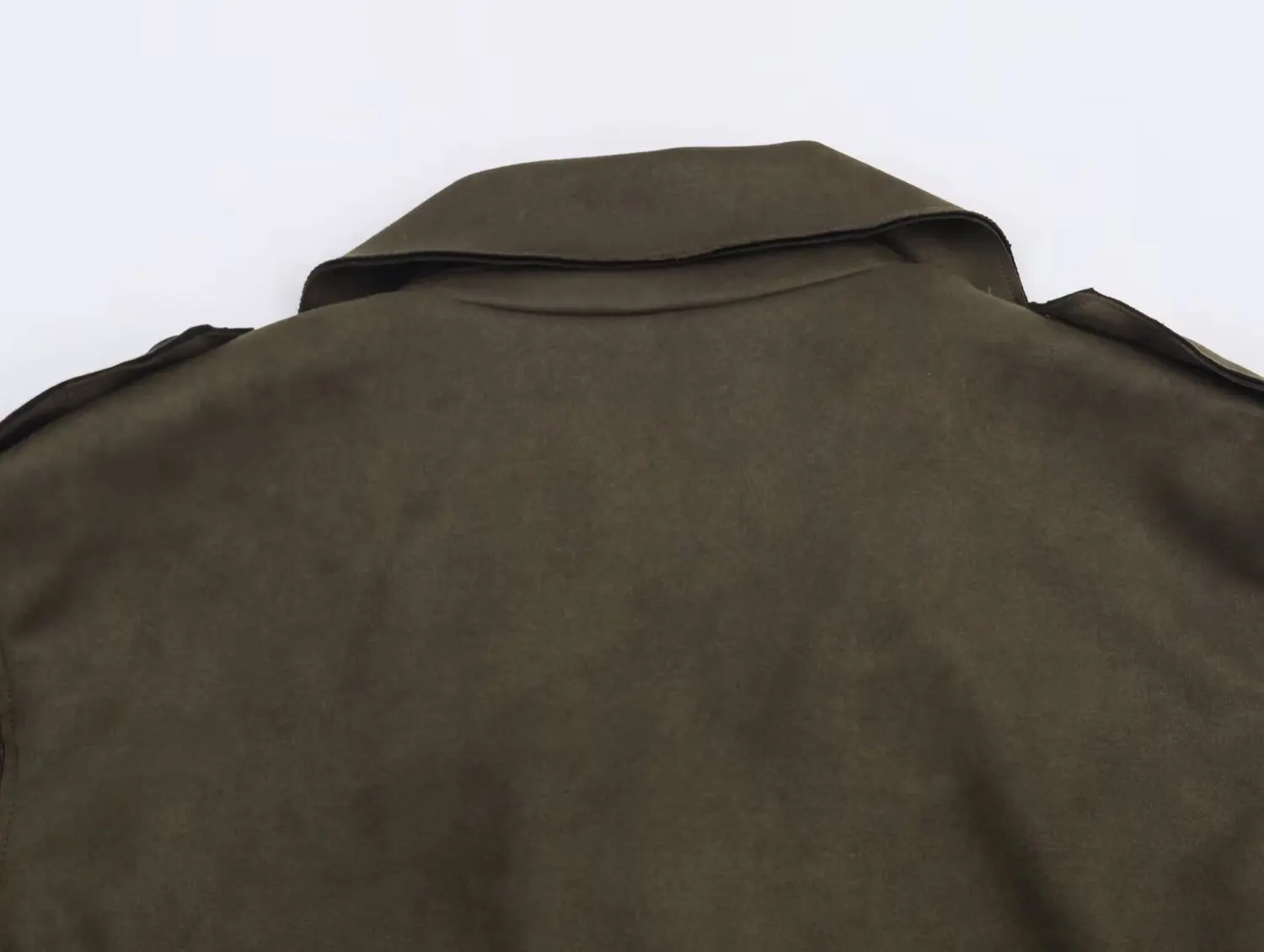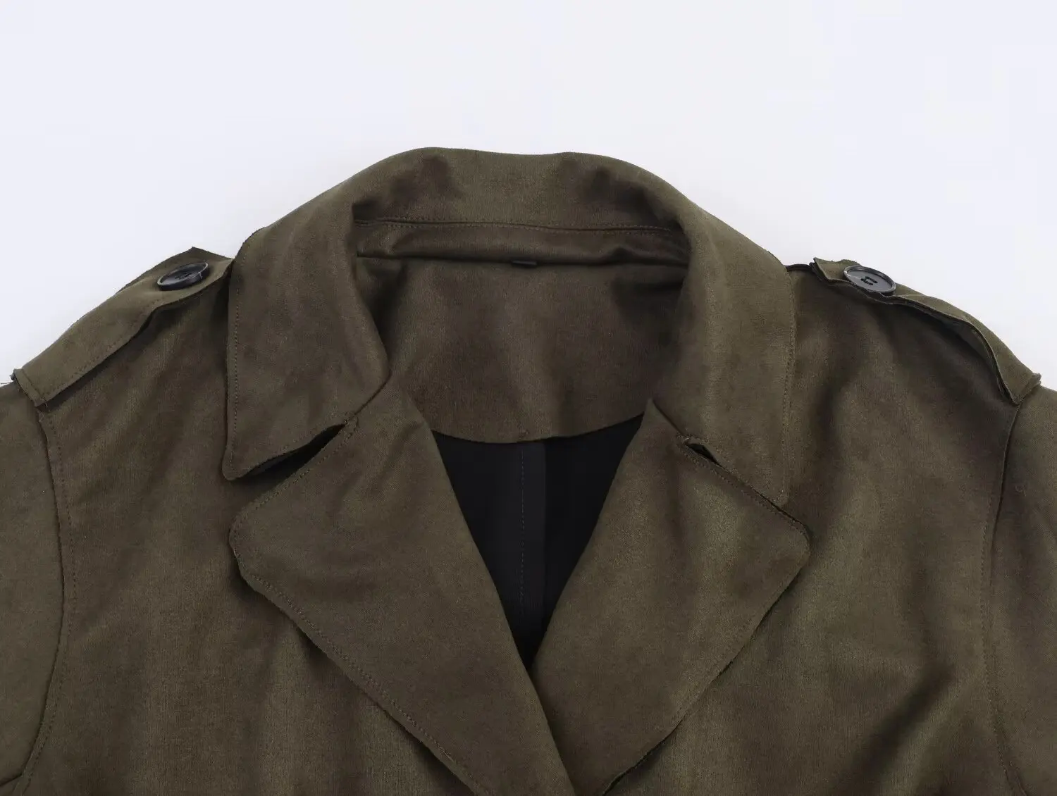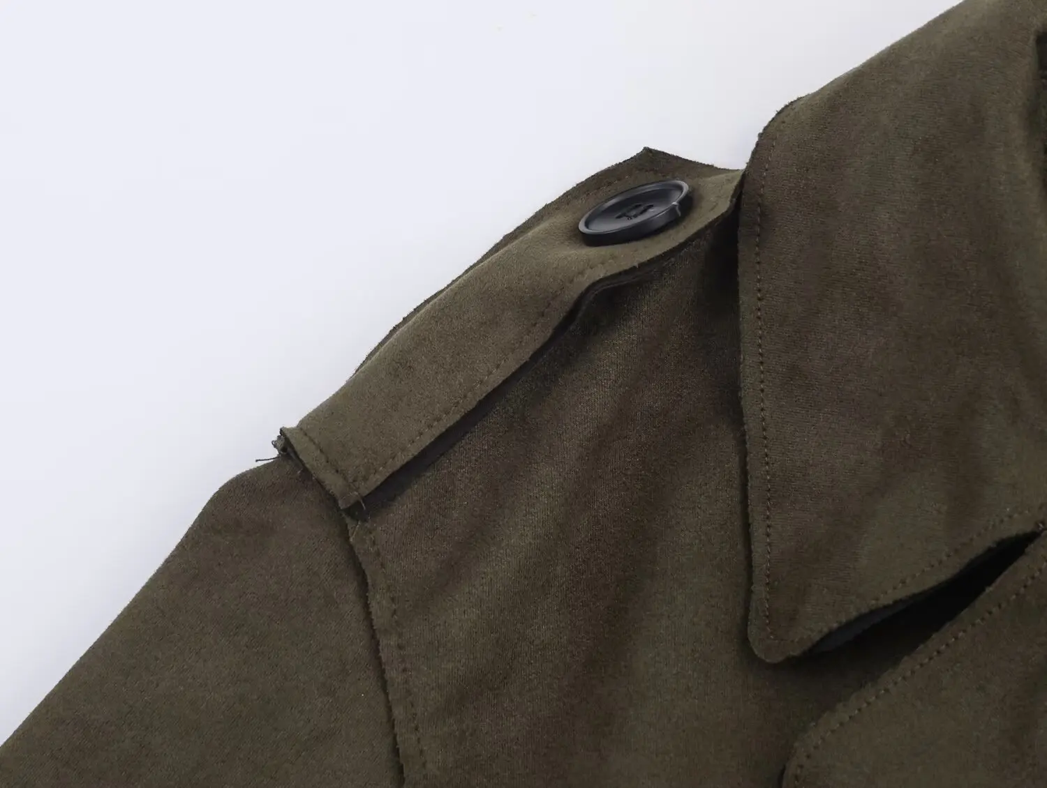 European style new women's fashionable and versatile solid color long trench coat with belt and suede effect.