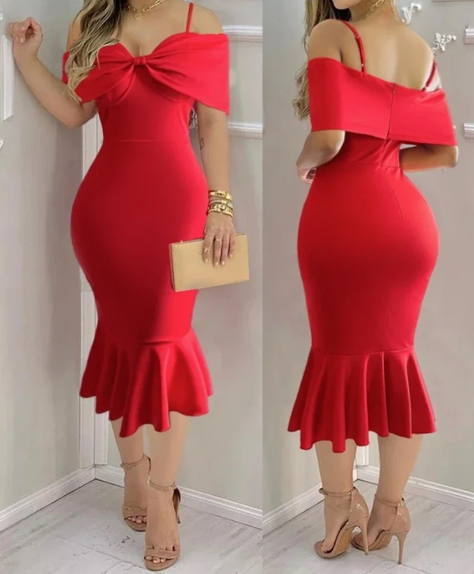 Fashion Women's Dresses 2025 Spring Elegant Off Shoulder Spaghetti Strap Fishtail Midi Bodycon Bowknot Design Sexy Party Dress