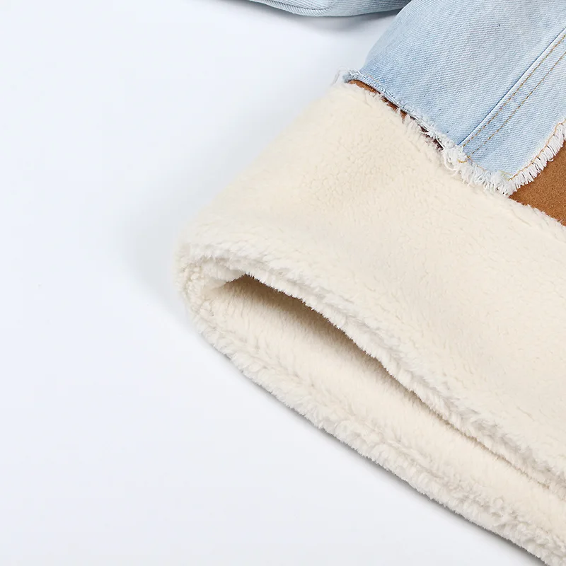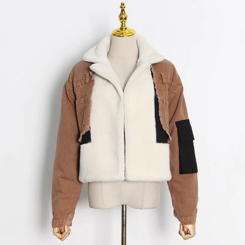 Warm Coats velvet thick denim stitching lamb hair lapel cotton Coat Jean women jacket top lamb wool coat
