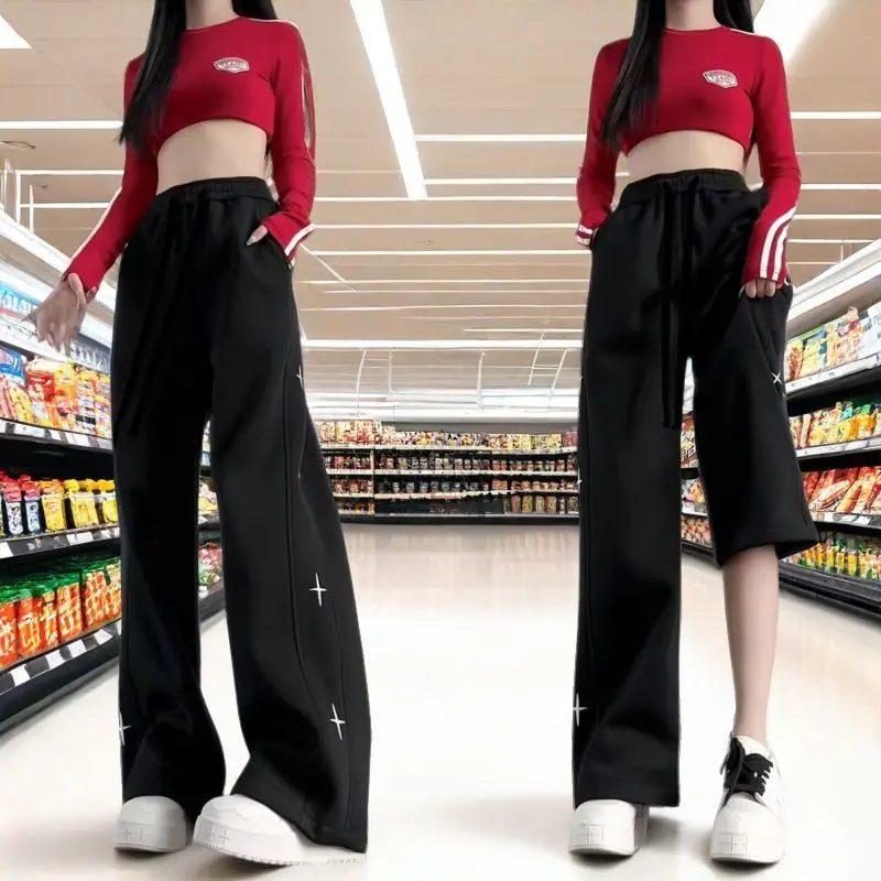 Wide-leg Trousers for Women Spring Summer Loose Thin Style Trendy for Students Petite Casual Sportswear, Straight-leg Pants