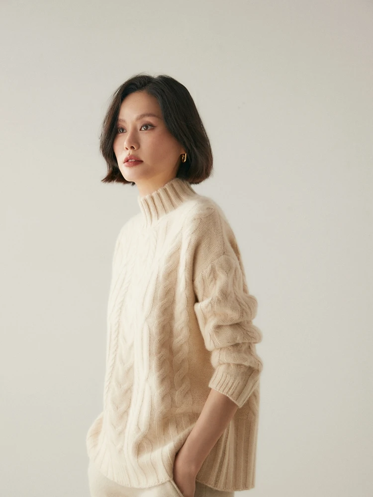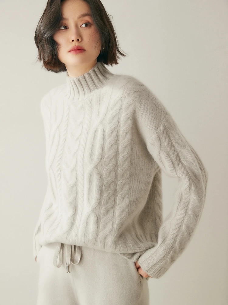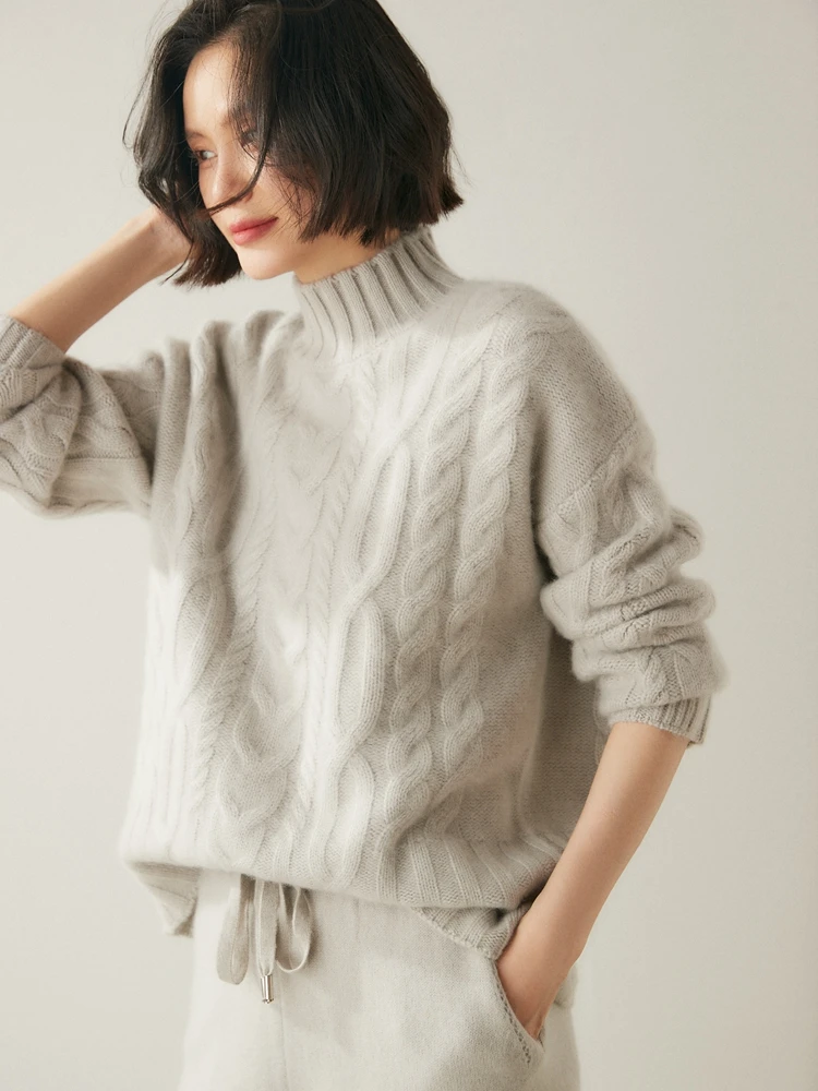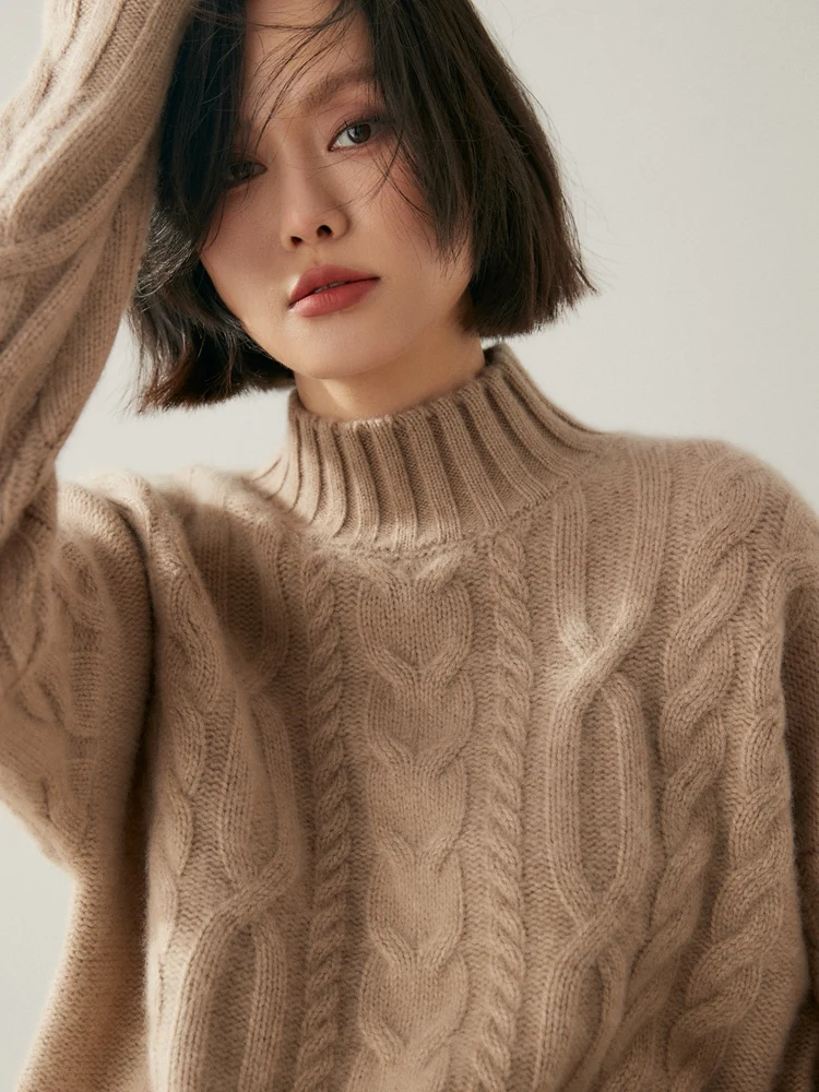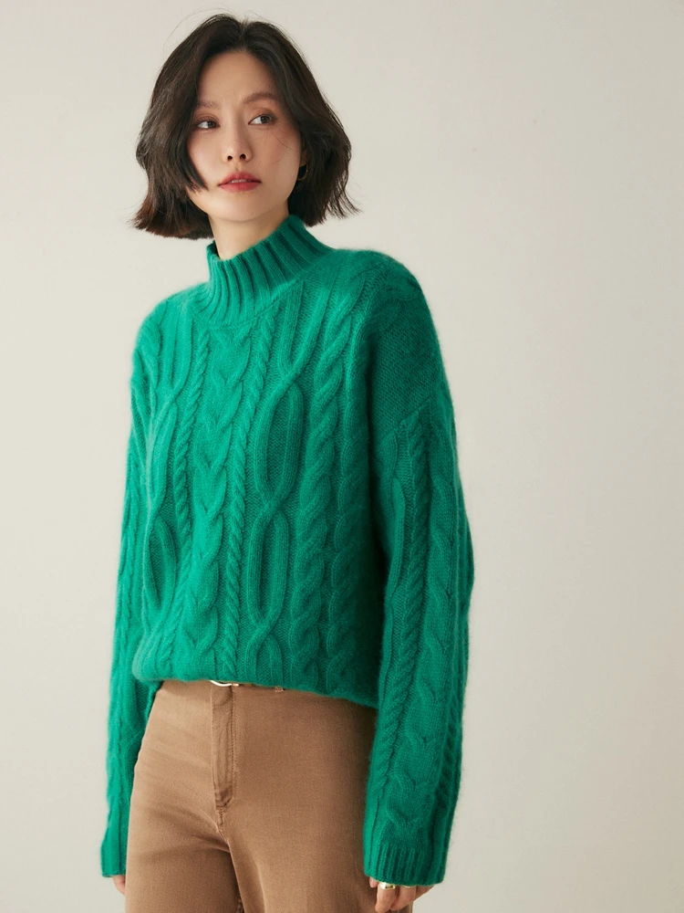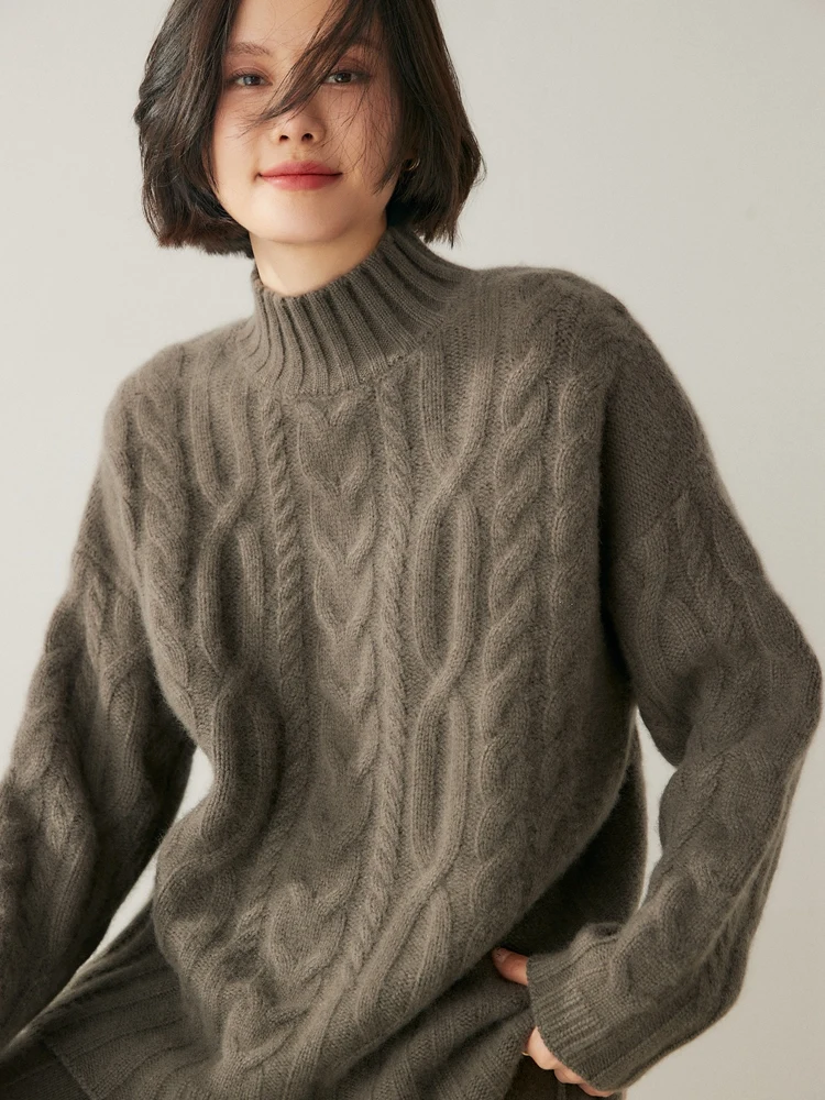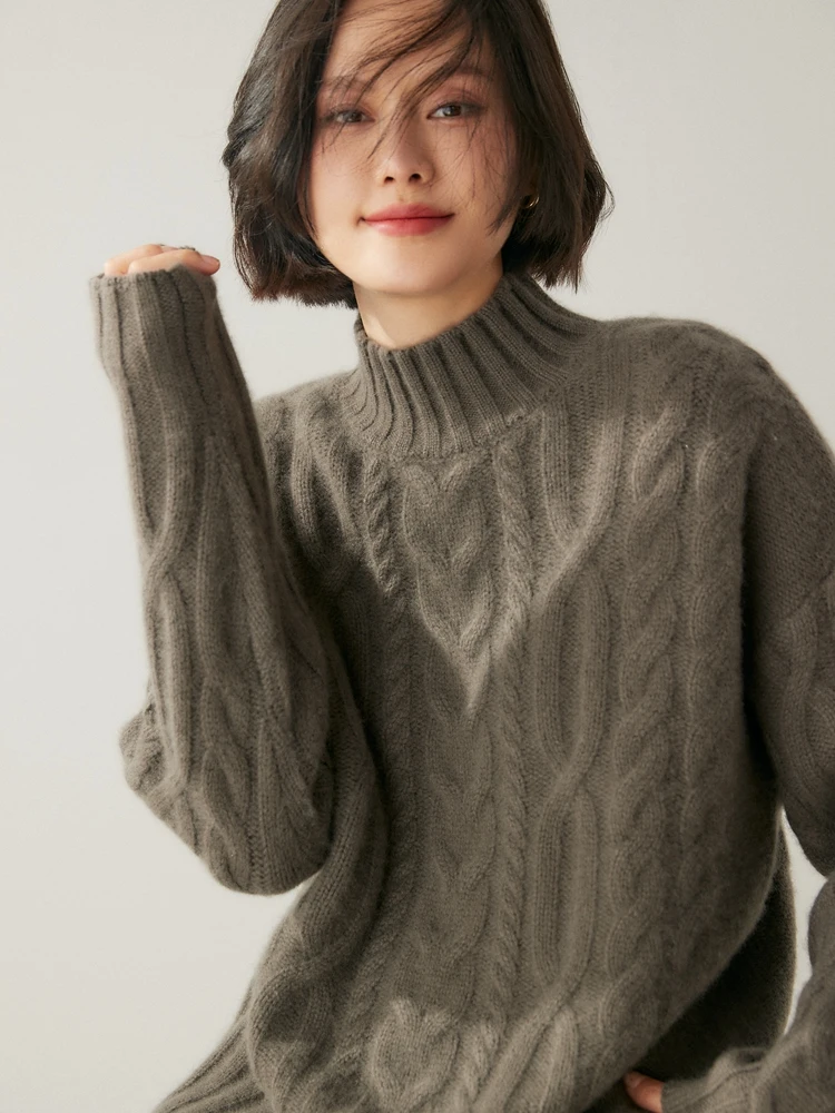 Women 100% Cashmere Sweater Mock Neck Pullover Cable Knitting Vintage Loose Style Thickened Cashmere Knitwear Autumn Winter Tops