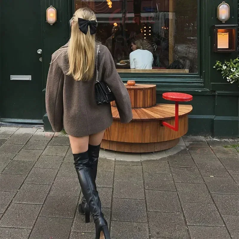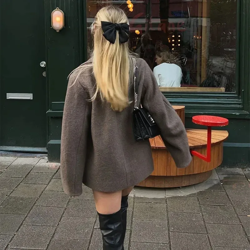 Women's Double Breasted Wool Coat Autumn Winter Fashion Lapel Long Sleeves Short Blazer Jacket Elegant Solid Warm Loose Outwear
