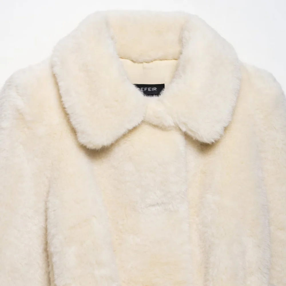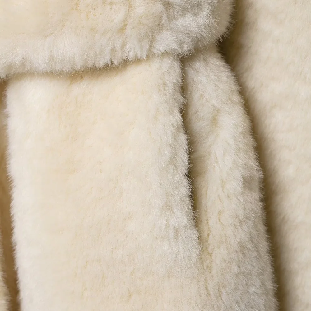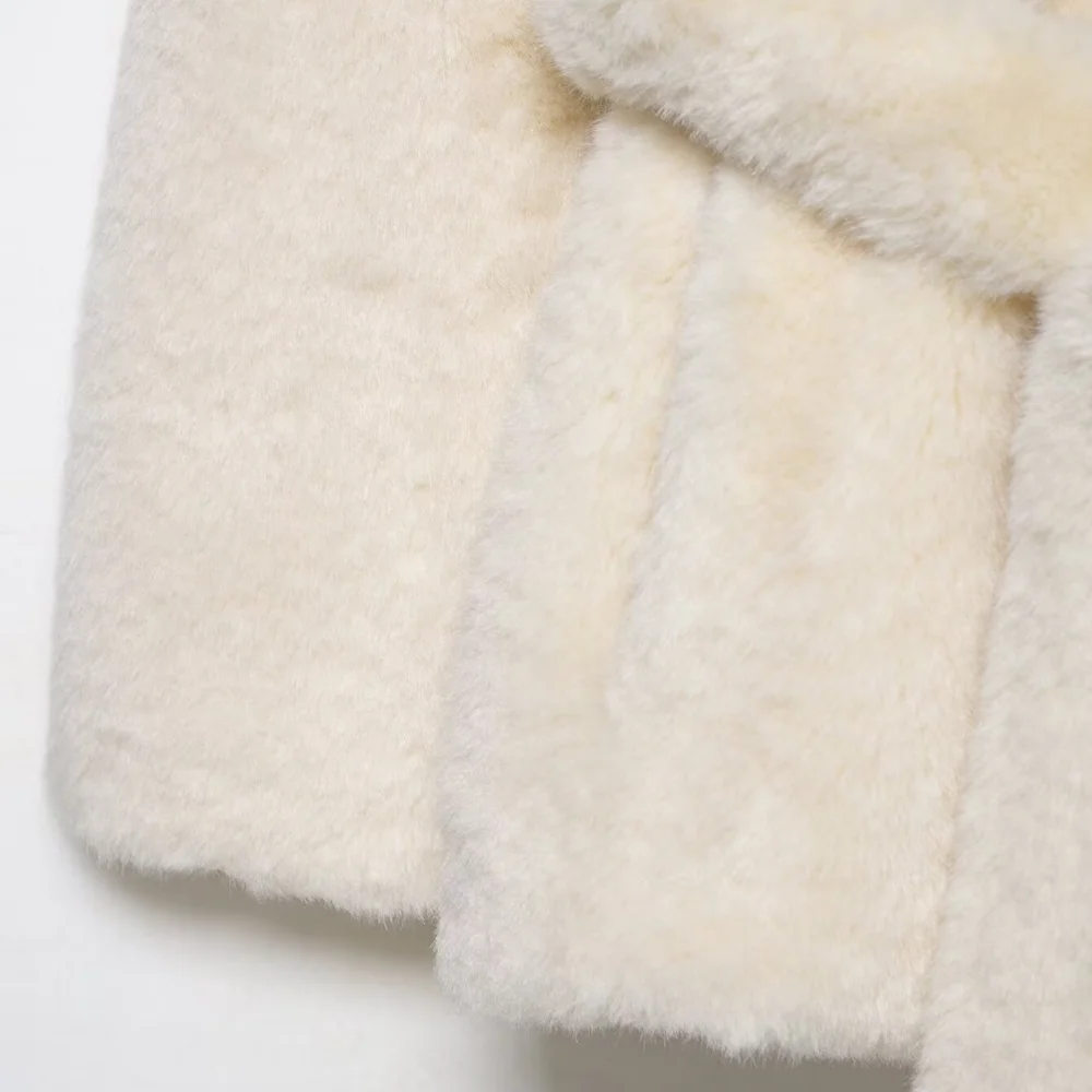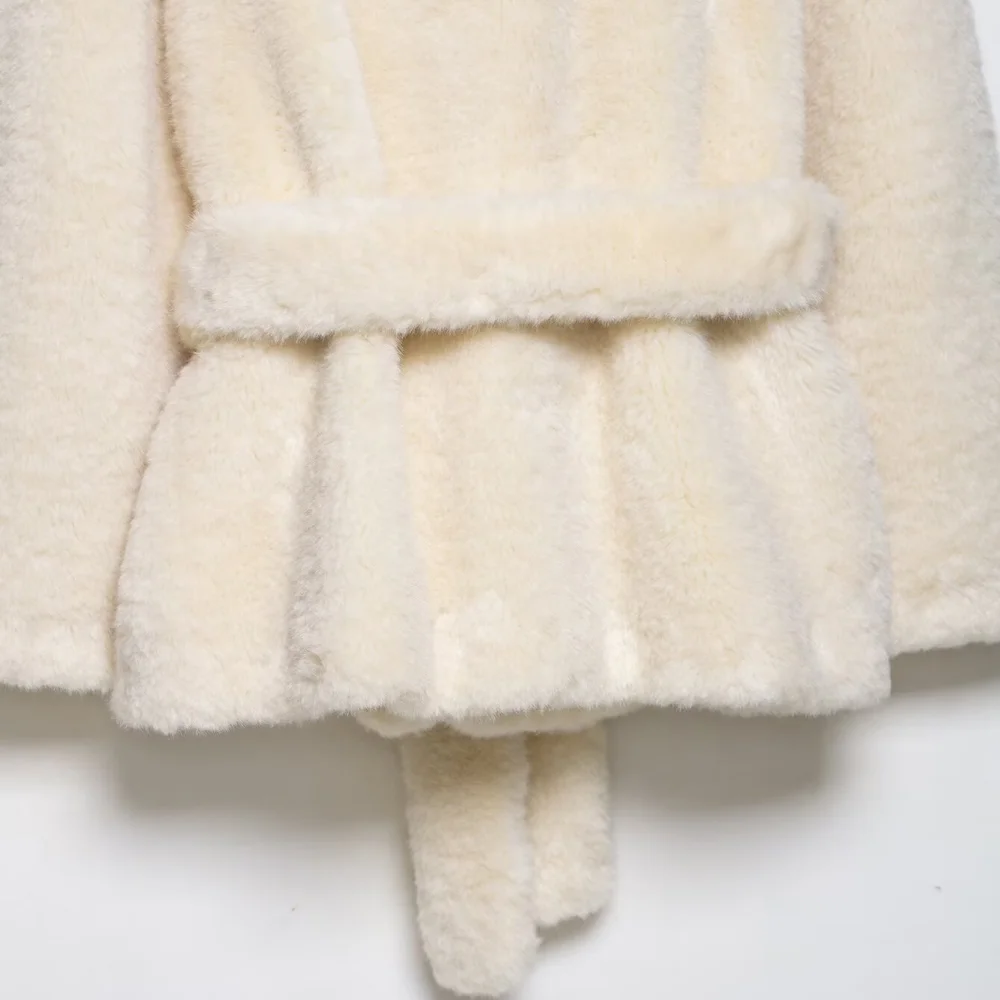 Women's fur loose jacket with lapel long sleeved pocket and waist belt autumn and winter new warm jacket