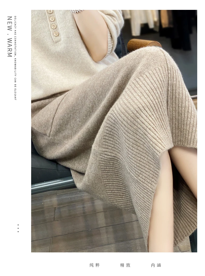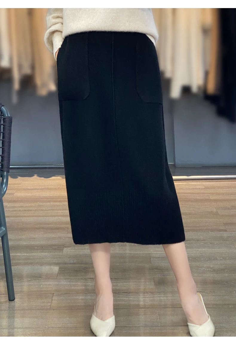 Women's Knitted Cashmere Skirt Double Pocket 100% Pure Wool Commuter Joker Straight Skirt for Autumn Winter New