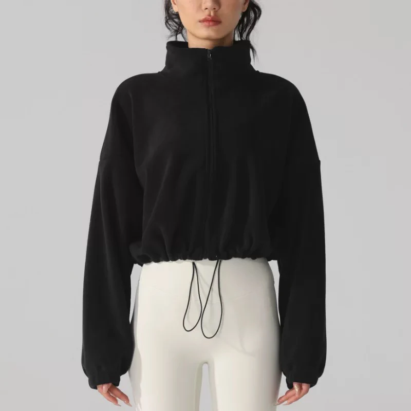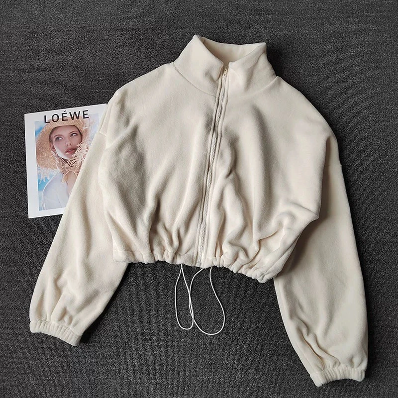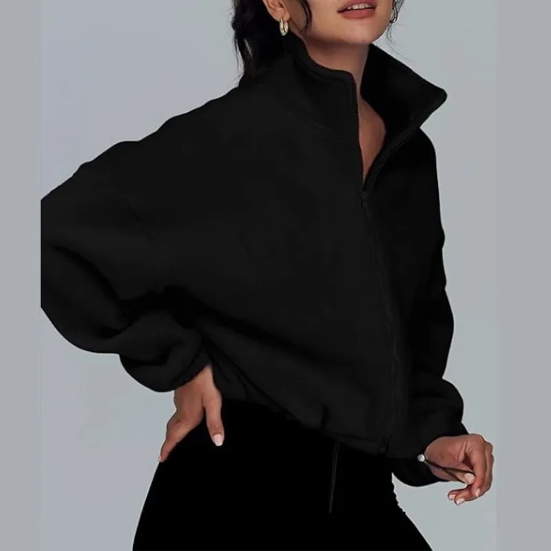 Women's warm sports and leisure jacket, autumn and winter fleece stand up collar loose and plush warm short jacket